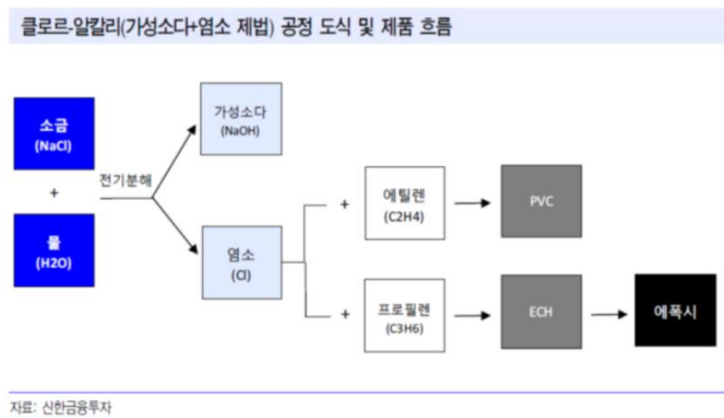- 소금물 → (전기분해) → 염소 + 가성소다