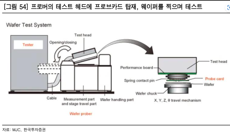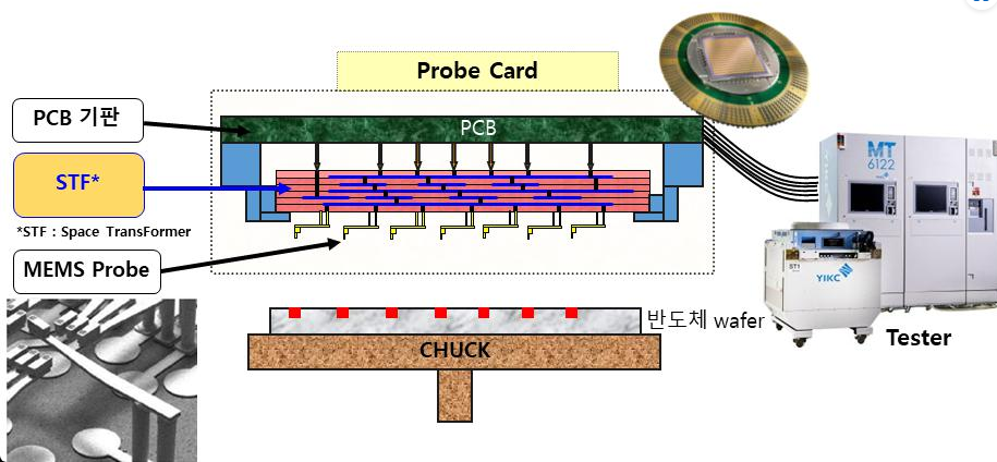 웨이퍼 상의 IC와 검사 장비 사이 전기적 연결을 제공. 프로브 핀이 IC의 패드에 접촉하여 전기 신호를 전달합니다.